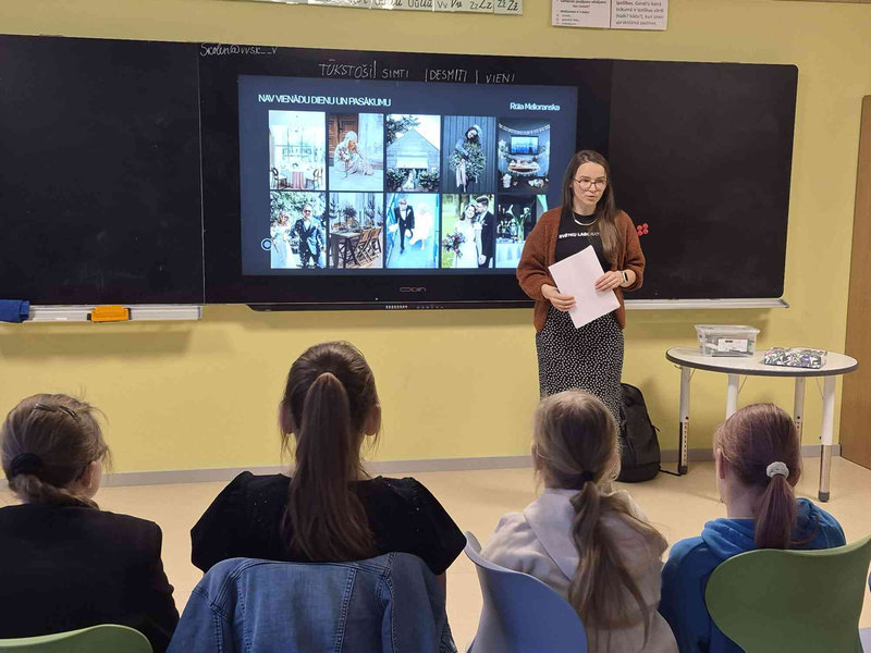 Savukārt 3.a klases skolēni tikās ar mūsu skolas absolventi, uzņēmēju Rūtu Melioransku, kura jau 13 gadus darbojas pasākumu dekorēšanas, poligrāfijas un režijas jomā- vada uzņēmumu un realizē savas un klientu idejas pilna servisa pasākumu aģentūrā “Svētku laboratorija”.